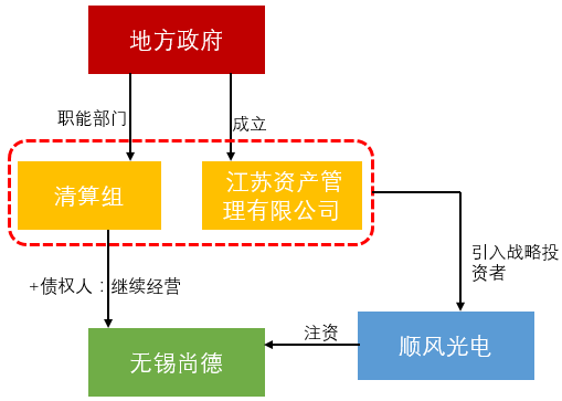 由地方政府職能部門組成的清算管理人在對無錫尚德進行調研的基礎上,與債權人達成一致讓企業得以繼續經營。江蘇省人民政府同意由無錫市國聯發展(集團)有限公司作為主發起人設立江蘇省資產管理有限公司。
