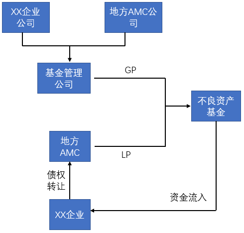 由資金周轉困難的公司和資產管理公司合資成立的一般合伙人(GP),與資產管理公司共同組建不良資產處置基金,基金以籌集的資金向陷入困境的公司發放1億元借款,專項用于其到期部分債務的替換和轉貸,以及生產流動性資金支出。