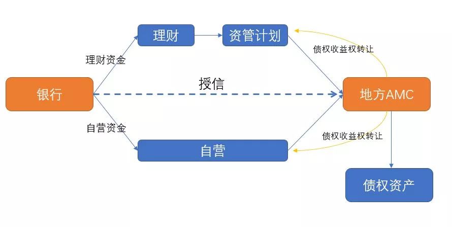 在通道模式被禁止之后,在2017年左右,有地方AMC通過向銀行轉讓其買斷的債權資產收益權的方式進行融資。該類模式代持模式有點類似,地方AMC向銀行轉讓債權收益權,但是區別在于是地方AMC遠期回購該資產,而不是銀行,即該資產的風險由地方AMC承擔。