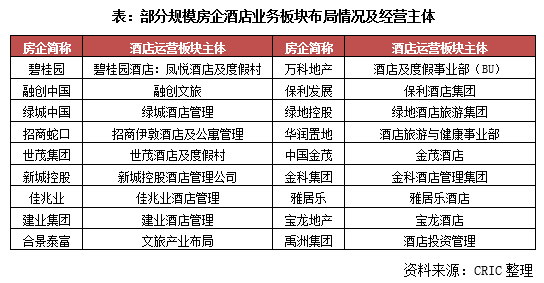 截至目前,在TOP50規(guī)模房企中有不少企業(yè)都已經(jīng)成立了獨立的酒店業(yè)務板塊,如碧桂園酒店(鳳悅酒店及度假村)、萬科酒店及度假事業(yè)部(BU)、融創(chuàng)文旅、保利酒店集團、綠城酒店管理等。此外,綠地、招商、華潤、世茂、金茂、新城、金科、佳兆業(yè)、雅居樂等規(guī)模房企也都有相對成熟的酒店業(yè)務管理公司。