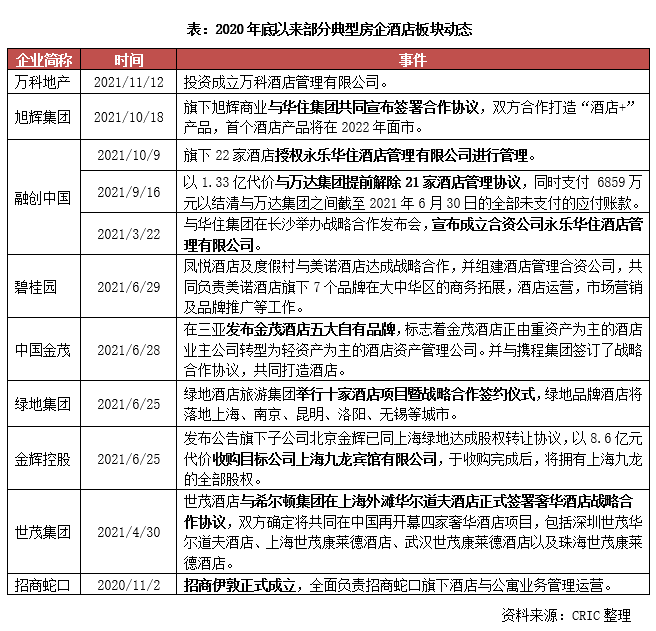 今年以來,碧桂園、萬科、融創(chuàng)、金茂、綠地、旭輝等多家規(guī)模房企在酒店板塊均有所動作,更多地加強了運營管理層面構建。以融創(chuàng)為例,2021年3月與華住集團宣布成立合資公司永樂華住酒店管理有限公司,持股50%,完成了自營平臺的搭建。9月即與萬達集團提前解除21家酒店管理協(xié)議,隨后將該21家酒店與哈爾濱融創(chuàng)萬達嘉華酒店均授權至永樂華住進行管理。從這一系列動作來看,融創(chuàng)在加速構建酒店板塊自營競爭力。另外,融創(chuàng)在2021 年中期業(yè)績會中也表示,“地產(chǎn)+”業(yè)務是未來三年重要發(fā)力,占比盡快超過集團10%。可以預計,酒店板塊作為“地產(chǎn)+”業(yè)務核心賽道之一,中長期將作為企業(yè)戰(zhàn)略重點推進。