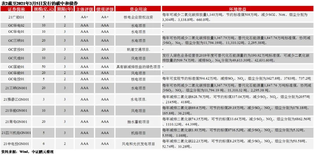 截至3月5日,已成功發行15只碳中和債券,募集資金規模214億元,具體情況見表1。其中碳中和公司債9只,募集資金規模150億元;碳中和債務融資工具6只,募集資金規模64億元。