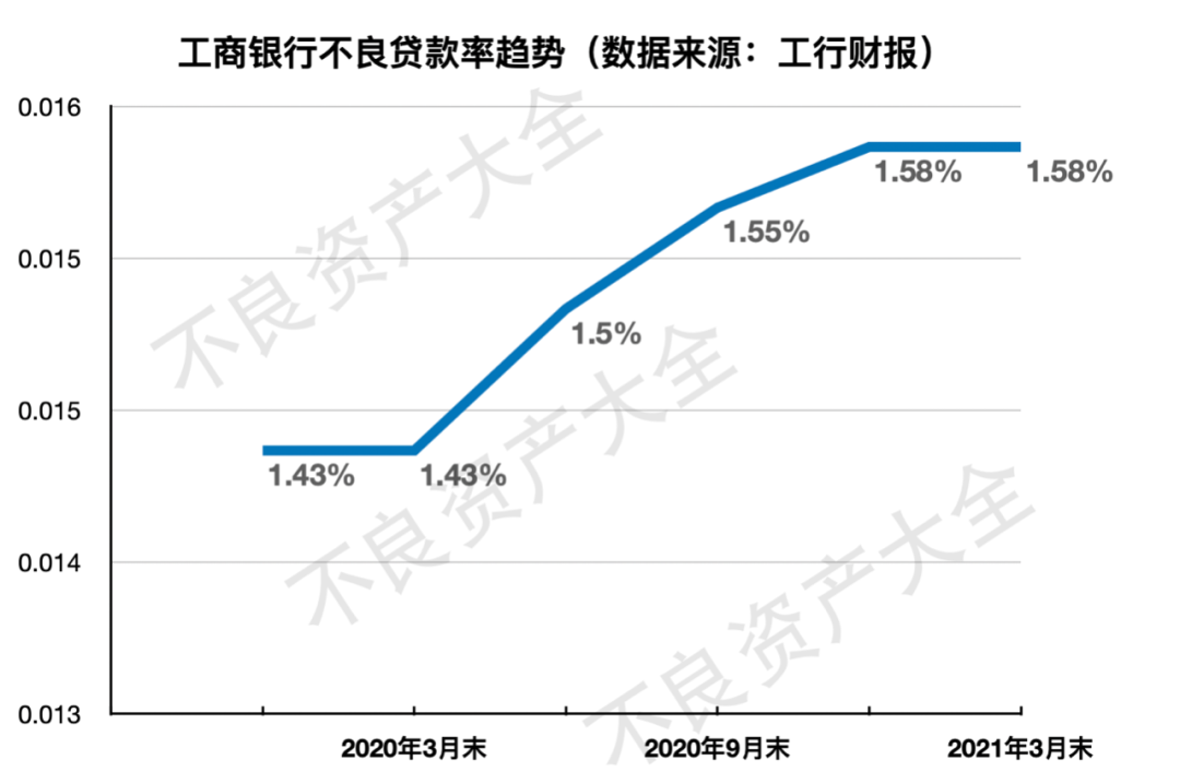 據(jù)工商銀行2021年一季度財報顯示,截至2021年3月31日,按照貸款質(zhì)量五級分類,工商銀行不良貸款余額3070.43億元,比上年末增加130.65億元;不良貸款率1.58%,與上年末持平;撥備覆蓋率183.22%,比上年末提高2.54個百分點(diǎn)。