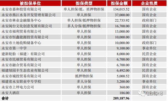 從明細可以看出,擔保對象主要是國企、政府部門和事業單位,其中有兩家民企,不過合計金額大致是1.45億,相對比較小。最大的兩筆擔保是對當地國企永安市嘉和投資有限公司(永安市財政局持股100%)和永安市燕江水務開發管理有限公司(直接股東是永安市灌區水利管理站,持股17.5%,永安市自來水公司持股7.5%,中國農發重點建設基金有限公司,持股75%,農發基金應該是明股實債,該公司實際控制人應該是永安市財政局)的擔保,金額分別是13.4億和3.7億。這兩個國企沒有發過債,屬于當地大平臺對小平臺的擔保。