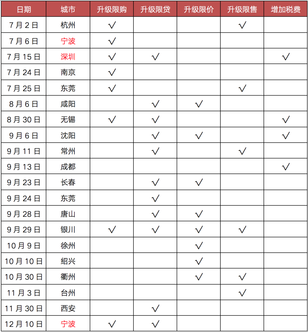 下半年伴隨著市場(chǎng)過熱,限價(jià)盤頻現(xiàn)“萬人搖”,土地市場(chǎng)高單價(jià)、高溢價(jià)地塊頻出、甚至“面粉貴過面包”的情況在部分二三線城市再次出現(xiàn),極大挑戰(zhàn)“穩(wěn)地價(jià)、穩(wěn)房?jī)r(jià)、穩(wěn)預(yù)期”的調(diào)控目標(biāo)。杭州、沈陽(yáng)、西安和寧波等19城政策加碼,主要涉及升級(jí)限購(gòu)、升級(jí)限貸、升級(jí)限價(jià)、升級(jí)限售以及增加房地產(chǎn)交易稅費(fèi)等內(nèi)容,其中深圳政策力度最嚴(yán)苛,寧波更是兩度政策加碼。