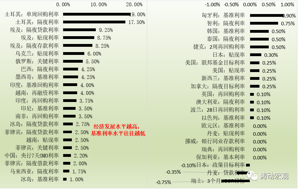 以主要經濟體的最新基準利率數據為例,土耳其、埃及、烏克蘭、俄羅斯、巴西、墨西哥、印度、越南等經濟體的基準利率水平便比較高,而瑞士、丹麥、日本、挪威、加拿大、澳大利亞、新西蘭與美國等經濟體的利率水平便比較低。