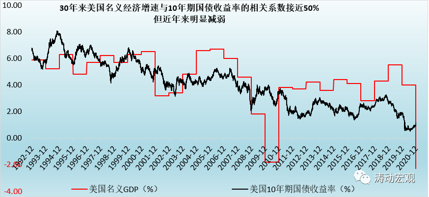 美國的數據可以向我們很好地證明這樣一個結論,即名義經濟增速不僅和長端利率水平高度正相關,在數值上甚至也比較接近。例如,1992年以來的30年,美國名義經濟增速與10年期國債收益率的相關系數接近50%。