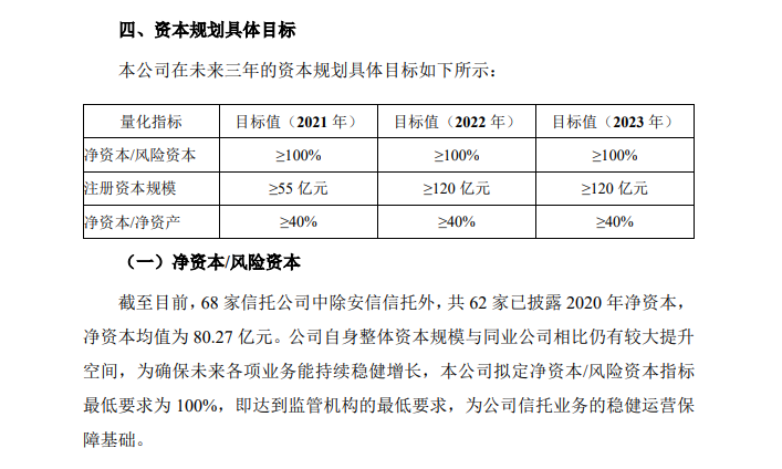回看7.24日的公告,在《未來三年資本管理及使用規(guī)劃》中,找到了答案。在這份公告和另一份《未來三年股東回報(bào)規(guī)劃》中,安信信托已經(jīng)謀劃了未來三年發(fā)展的計(jì)劃。