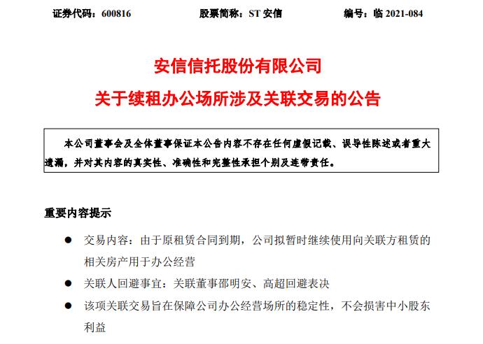 除此以外,一份涉及到關(guān)于安信信托續(xù)租辦公場(chǎng)所涉及關(guān)聯(lián)交易的公告,卻意外透露了一些信號(hào)。