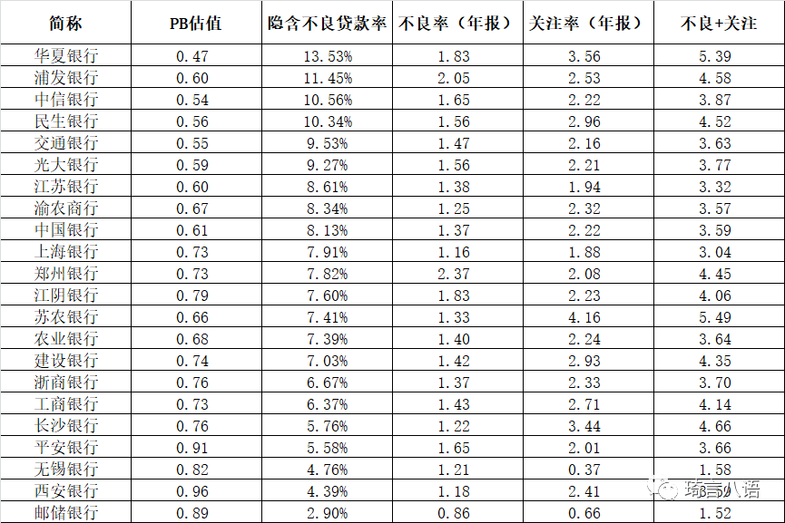 因此,可以參照當前的估值水平,根據:銀行隱含不良率=【銀行貸款減值準備+(1-當前PB)*凈資產)】/貸款余額,逆推出市場認為的隱含不良率,目的是可以在一定程度上考量銀行的真實不良率水平。