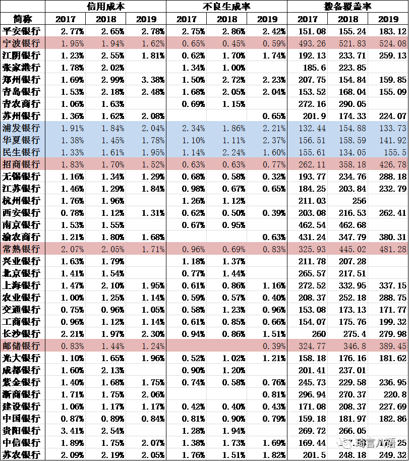 寧波銀行的信用成本(1.62%)遠大于不良生成率(0.59%),導致其撥備覆蓋率進一步上升至524.08%,表現出較強的風險管理能力,也是寧波銀行能在近兩年持續獲得估值溢價的體現。招商銀行、常熟銀行、郵儲銀行同樣如此。