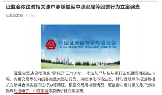 此外,還有3家券商也被卷入其中,分別是民生證券、恒泰證券、天風證券。周五(5月14日)證監會表示已啟動核查程序,周日(5月16日)證監會進一步發聲,依法對相關賬戶涉嫌操縱中源家居等股票行為立案調查。