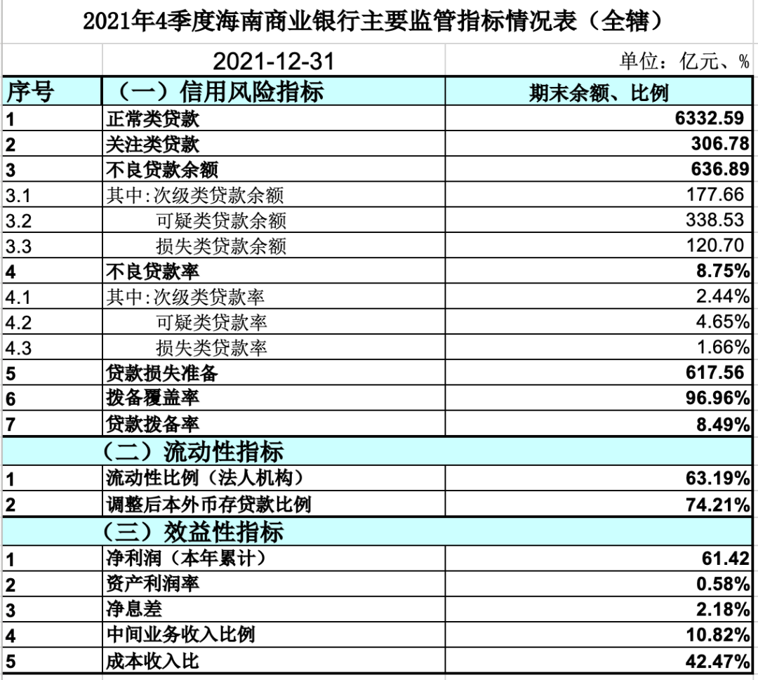 具體到海南,2020年末,海南商業(yè)銀行不良貸款余額140.84億元,不良率2.11%,撥備覆蓋率440.71%,整體情況不算差,尤其撥備覆蓋率遠好于行業(yè)平均。但到去年末,海南商業(yè)銀行不良貸款余額暴增到636.89億元,不良率飆升至8.75%,撥備率掉到了96.96%。
