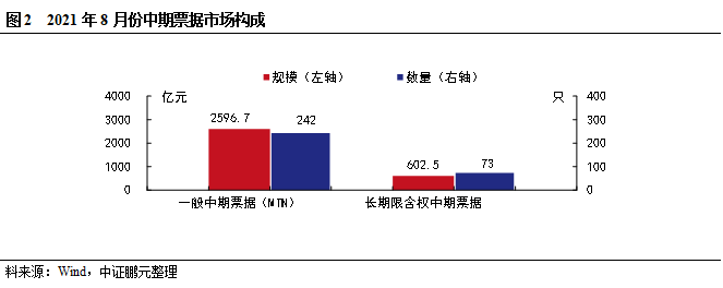 8月發行的中期票據中包括長期限含權中期票據73只,發行規模602.5億元。8月發行的短期融資券中包括超短融(SCP)459只,發行規模3,976.5億元。