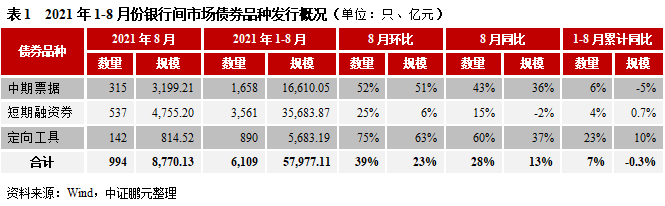 2021年8月,我國銀行間市場共發行信用債券994只,發行規模8,770.13億元,環比分別上升39%和23%,同比分別上升28%和13%。綜合1-8月來看,銀行間市場發行信用債券6,109只,發行規模57,977.11億元,比2020年同期發行數量和規模分別上升7%和下降0.3%。