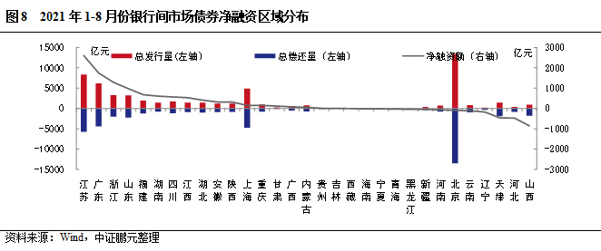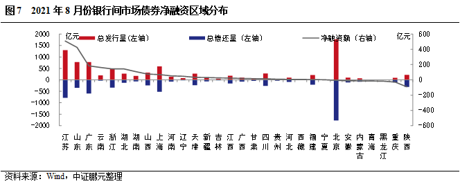區域分布方面,8月銀行間市場債券發行人主要分布在北京及東部沿海地區,北京以1,770.91億元位居發行規模第一位;8月表現為凈融資省份共23個,江蘇、山東、廣東分別以凈融資508.09億元、425.42億元、183.60億元排名前三位。其中,共有7個省份呈凈償還,區域主要分布在北方地區和重慶。