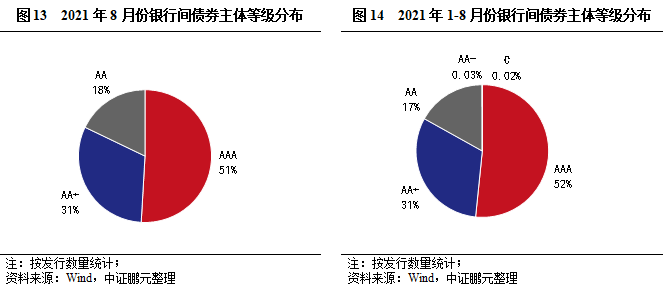 債券級別方面,8月銀行間市場債券以高級別為主,主體評級中樞略有下降。