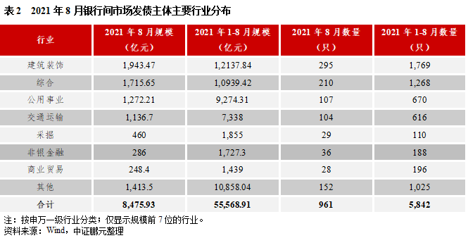 行業方面,建筑裝飾業和綜合業是8月銀行間市場債券發行的主力行業。