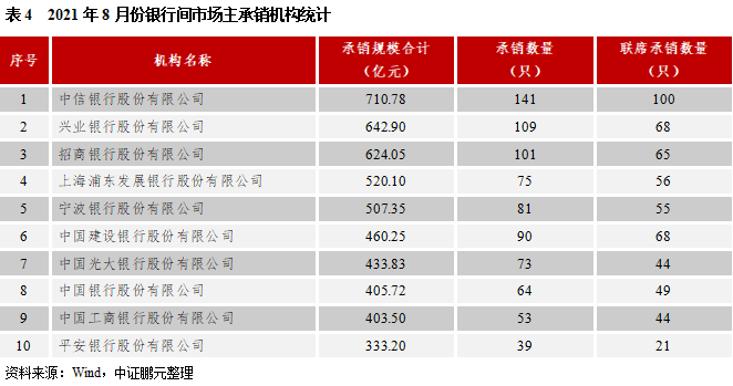 就承銷機構而言,2021年8月共有60家機構參與了銀行間市場的承銷工作。就承銷規模而言,中信銀行以710.78億元的承銷規模位居榜首,興業銀行以642.9億元位居第二,招商銀行以624.05億元的承銷規模位居第三。就承銷數量而言,中信銀行以承銷141只排名第一,興業銀行以承銷109只位列第二。在證券公司類承銷機構中,8月中信建投證券、華泰證券和中信證券的承銷規模位居前三,承銷額分別為249.07億元 、108.22億元和98.83億元。從承銷機構集中度來看,承銷規模排名前十的主承銷商合計規模占比達到56.85%,集中度相對較高。與2021年7月相比,承銷機構數量上升,集中度略有下降。