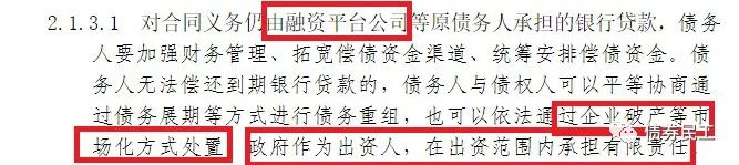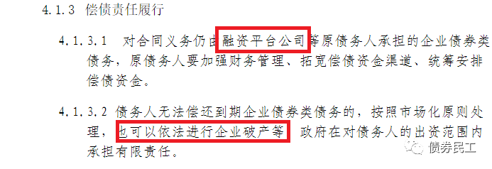 (2)對于企業債券的償債責任履行,鼓勵債務人(融資平臺公司)按照企業債券類債務有關管理政策進行債務重組或者通過企業破產等市場化方式處置。這里的企業債券概念應該是廣義上的信用債券概念,也是通過債務重組和破產方式進行化解債務問題。