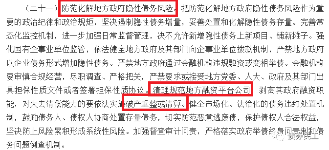 首先需要說明的是,《意見》中關于地方政府融資平臺的意見,是在“防范化解地方政府隱性債務風險”項下的,重點關注的是隱性債務。