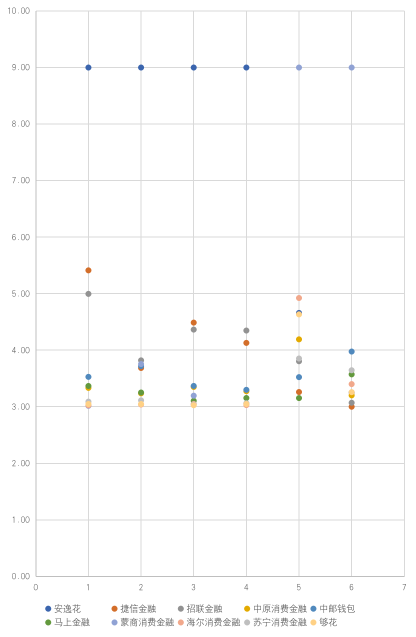 在月啟動(dòng)次數(shù)指標(biāo)上,安逸花APP同樣遙遙領(lǐng)先其他消費(fèi)金融APP,達(dá)到9分。捷信金融APP和招聯(lián)金融APP分別第二名(4.49分)和第三名(4.36)。其余消費(fèi)金融APP均未超過(guò)4分。
