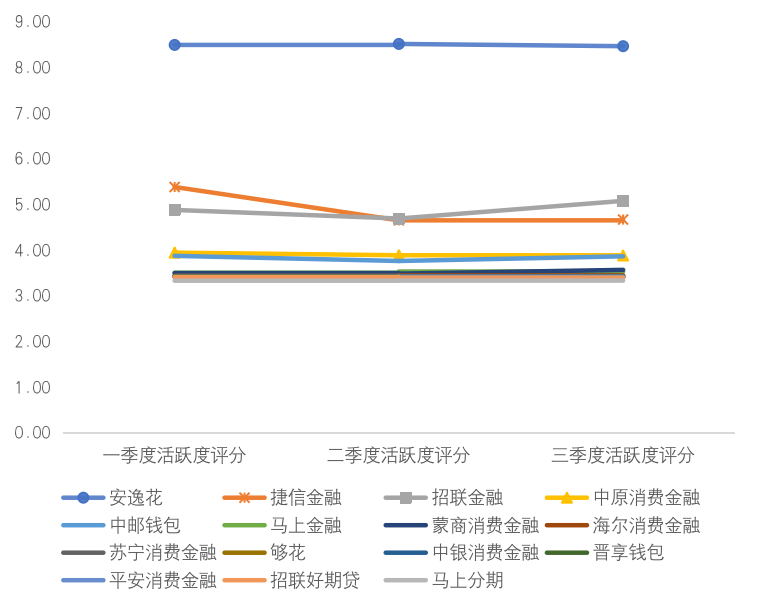 零壹智庫(kù)綜合對(duì)比15款A(yù)PP第一二三季度活躍度的評(píng)分發(fā)現(xiàn),安逸花、招聯(lián)金融、捷信金融APP的地位相對(duì)而言較為穩(wěn)定,始終位于前三。