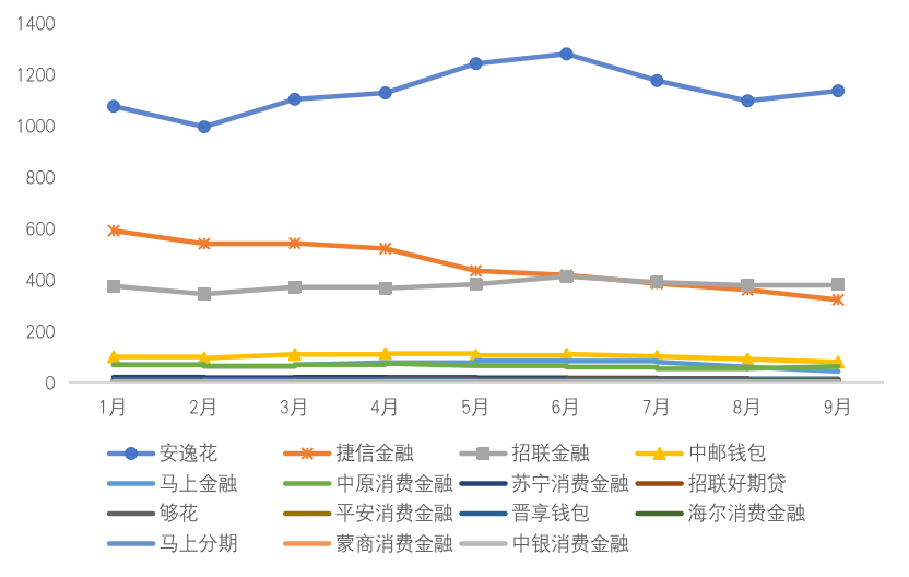 截至目前,我國(guó)已成立持牌消費(fèi)金融公司30家,行業(yè)市場(chǎng)份額較為集中。整體來(lái)看,多數(shù)消費(fèi)金融APP在上半年月活用戶(hù)數(shù)有所上升,下半年由于監(jiān)管趨嚴(yán),行業(yè)場(chǎng)景收縮,對(duì)部分涉及該場(chǎng)景的公司造成一定影響,月活躍用戶(hù)數(shù)量有所波動(dòng)。