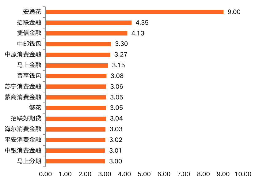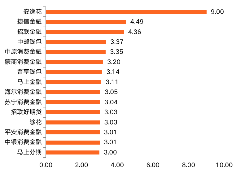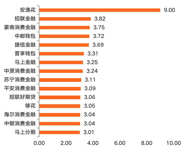 在月使用時(shí)長(zhǎng)指標(biāo)上,安逸花APP優(yōu)勢(shì)突出,遙遙領(lǐng)先于其他消費(fèi)金融APP,達(dá)到9分。招聯(lián)金融APP、蒙商消費(fèi)金融APP分別為第二名(3.82分)和第三名(3.75分),均未超過(guò)4分。