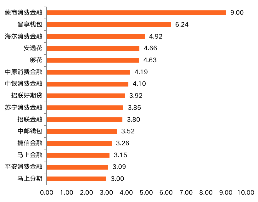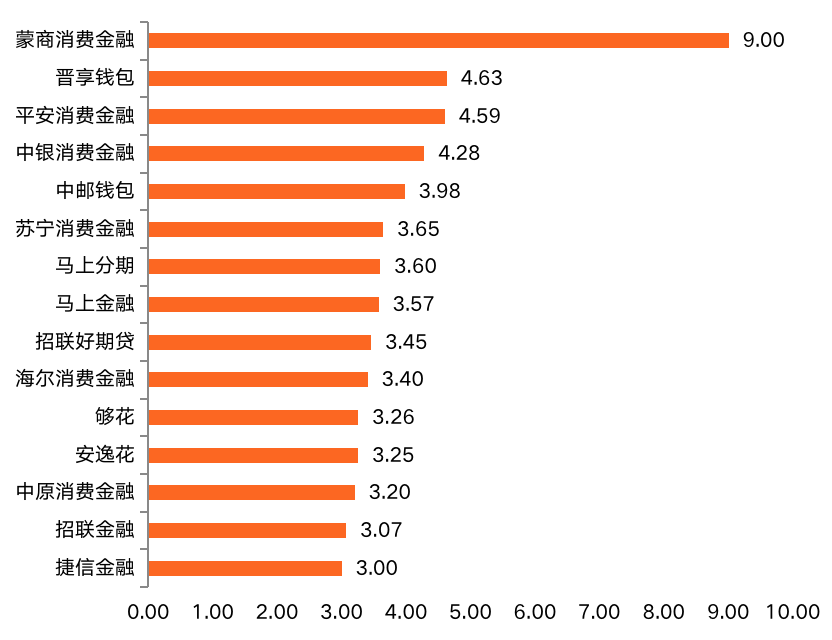 人均單日使用時(shí)長(zhǎng)一定程度上可以反映用戶(hù)依賴(lài)程度。蒙商消費(fèi)金融APP位列第一,得9分,優(yōu)勢(shì)明顯;第二名至第四名均在4-5分之間浮動(dòng),5-15名在3-4分之間浮動(dòng)。