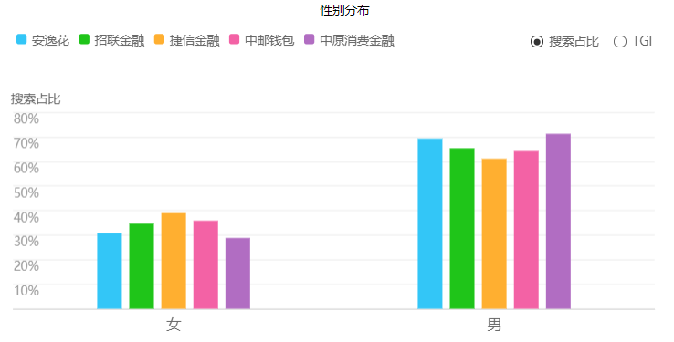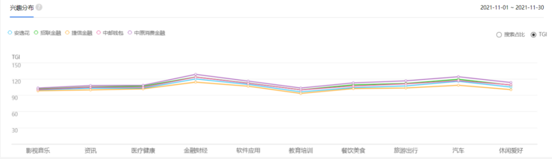 用戶(hù)畫(huà)像反映了關(guān)注消費(fèi)金融APP的用戶(hù)的年齡、性別和興趣分布。根據(jù)百度指數(shù)總結(jié)的用戶(hù)畫(huà)像可以看出,無(wú)論從年齡分布,還是性別、興趣分布來(lái)看,整體五款 APP 的用戶(hù)偏好相近,較為同質(zhì)化。