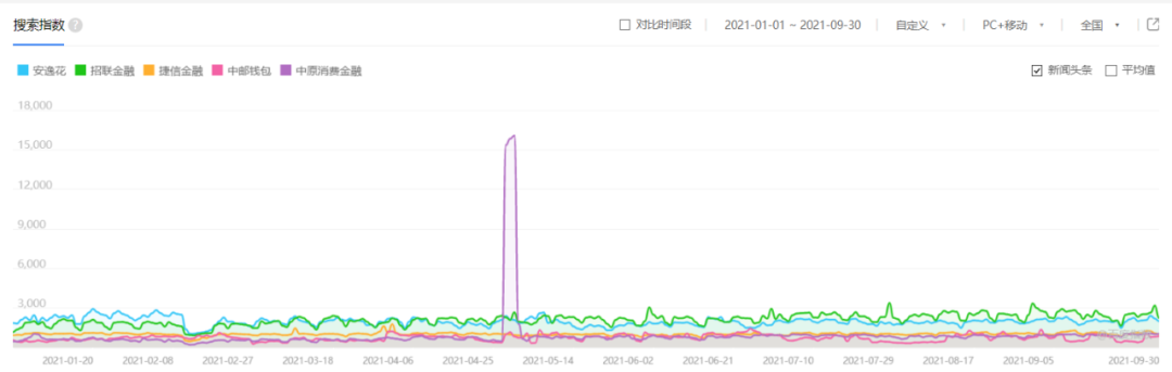 值得注意的是,中原消費(fèi)金融APP搜索指數(shù)于今年5月大幅上漲,躍居第一,隨后回落。此前2021年2月底,中原消金在業(yè)內(nèi)率先推出 “7天無(wú)理由還款”,引發(fā)熱議。