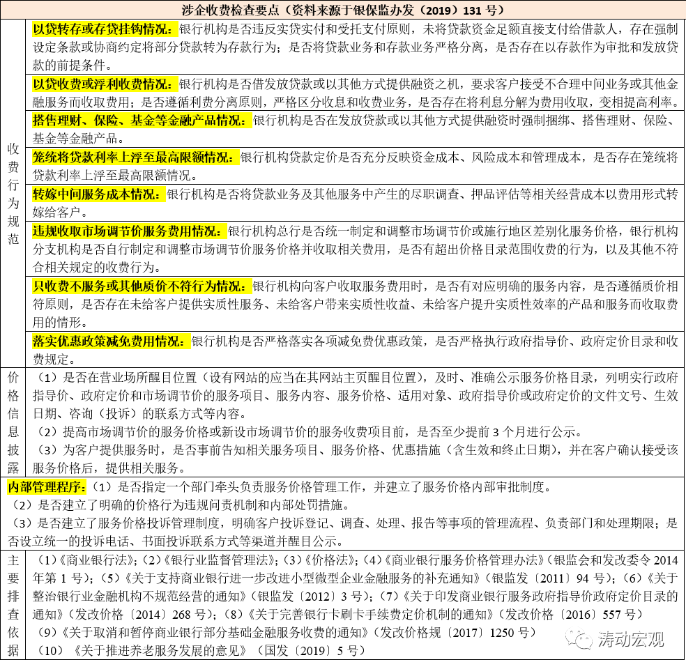 2019年5月27日,銀監會發布《關于開展銀行違規涉企服務收費6專項治理工作的通知》(銀保監辦發(2019)131號),明確提出相關檢查要求與制度依據,具體可見下表,這里不再贅述。