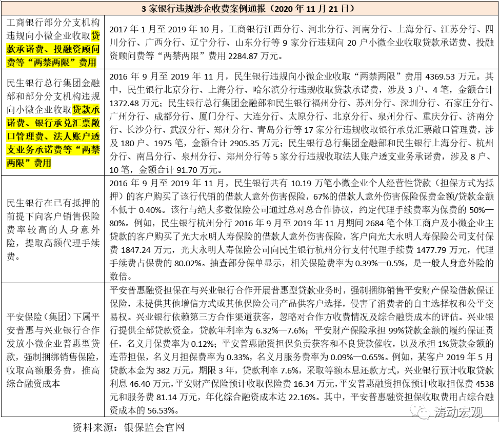 2020年11月21日,國務院辦公廳督查室、銀保監會辦公廳聯合發布《關于部分銀行保險機構助貸機構違規抬升小微企業綜合融資成本典型問題的通報》,指出工行部分分支機構、民生銀行、平安保險(集團)下屬平安普惠等機構在貸款中違規收取應減免費用,強制捆綁銷售,收取高額服務費和代理手續費。