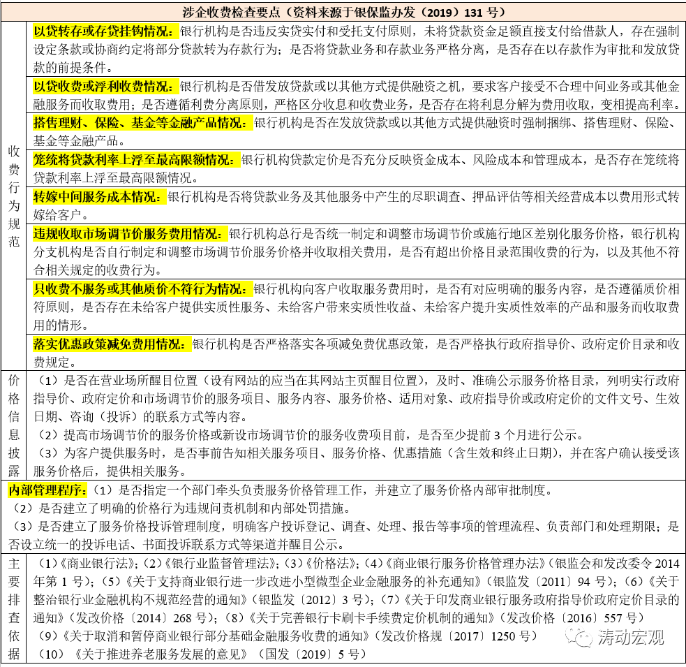 2019年5月27日,銀監會發布《關于開展銀行違規涉企服務收費專項治理工作的通知》(銀保監辦發(2019)131號),明確提出相關檢查要求與制度依據,具體可見下表,這里不再贅述。
