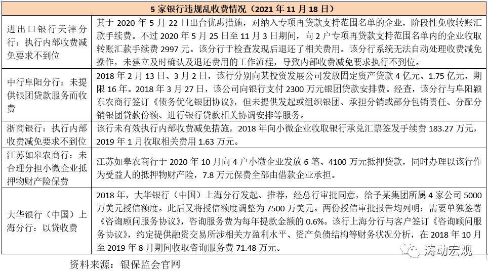 2021年11月18日,銀保監會消費者權益保護局發布《關于銀行服務違規收費典型案例的通報》(銀保監消保發(2021)16號)點名五家銀行,對其涉企違規亂收費案例進行通報。這五家銀行分別為進出口銀行天津分行、中行阜陽分行、浙商銀行、江蘇如皋農商行以及大華銀行(中國)上海分行。以上五家銀行的涉企違規收費問題主要分為四大類: