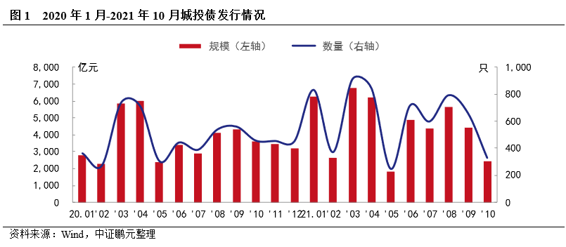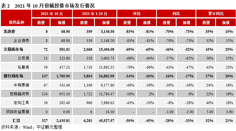 2021年10月份,各品種城投債共發行327只,發行規模2,435.81億元,發行數量同比下降28%、發行規模同比下降33%,環比分別下降50%和45%。綜合1-10月份,各品種城投債共發行6,281只,發行規模4.55萬億元,累計同比分別增長32%和21%。
