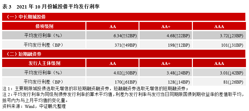 2021年10月份,無增信城投債的最高發行利率為7.80%,較上月低20BP,最低利率2.36%,較上月高16BP,發行利率區間收窄。分級別來看,長期限無增信AA級、AA+級、AAA級城投債平均發行利率較上月分別上行52BP、上行22BP、下行23BP;短期限品種的無增信AA級、AA+級、AAA級城投債平均發行利率較上月分別下行50BP、24BP、42BP。發行利差方面,長期限無增信AA級、AA+級、AAA級城投債分別較上月分別擴大49BP、擴大12BP、收窄31BP,短期限無增信AA級、AA+級、AAA級城投債分別上月收窄61BP、14BP、26BP。