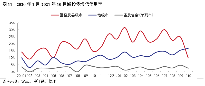 2021年10月份,城投債總體增信使用率為11.0%,較上月下降5.13個百分點。從行政級別上來看,區縣級平臺、地級市平臺和省級平臺的增信使用率分別為10.0%、16.8%、2.6%,較上月分別下降14.9個百分點、上升1.4個百分點和下降2.2個百分點。因區縣級平臺發行難度上升,該級發債主體的大幅下使增信使用率也隨之下降,而地級市平臺的增信使用率仍保持上升趨勢,市場對城投的風險偏好降低。