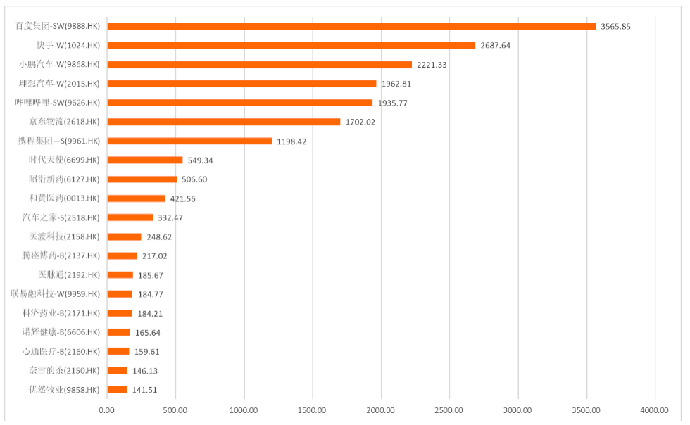 超過百億規模的共有6家企業,分別為快手(1024.HK)、京東物流(2618.HK)、百度集團、嗶哩嗶哩、小鵬汽車、理想汽車,其中快手以478.35億港元的募資額高居榜首。而京東物流是國內最大的供應鏈物流巨頭,也是繼京東、達達集團、京東健康后,京東系的第四個IPO。小鵬和理想作為國內領先的智能汽車企業,赴港上市進一步彌補了港股市場的科技股的短缺。