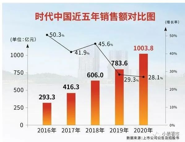 2016-2020年,時代中國控股從293億銷售規模一路狂奔至千億,銷售增速分別為50.3%、41.9%、45.6%、29.3%以及28.1%。