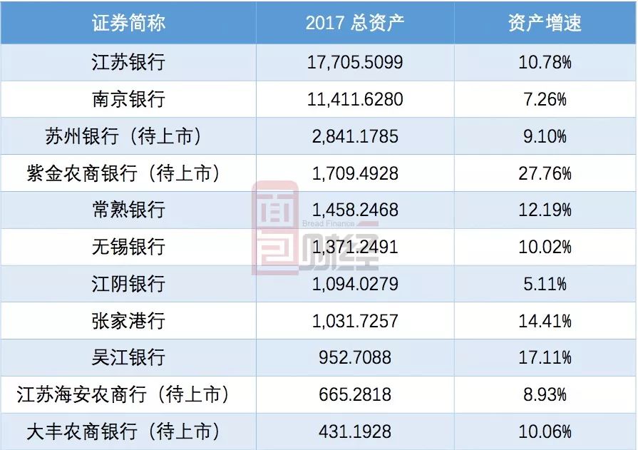 目前,已經(jīng)上市的銀行分別為江蘇銀行、南京銀行、常熟銀行、無錫銀行、張家港行、江陰銀行以及吳江銀行。截至2017年底,這7家銀行總資產(chǎn)3.5萬億,同比增長9.7%。其中江蘇銀行與南京銀行兩家城商行總資產(chǎn)規(guī)模超過萬億,分別為1.14萬億與1.77萬億。