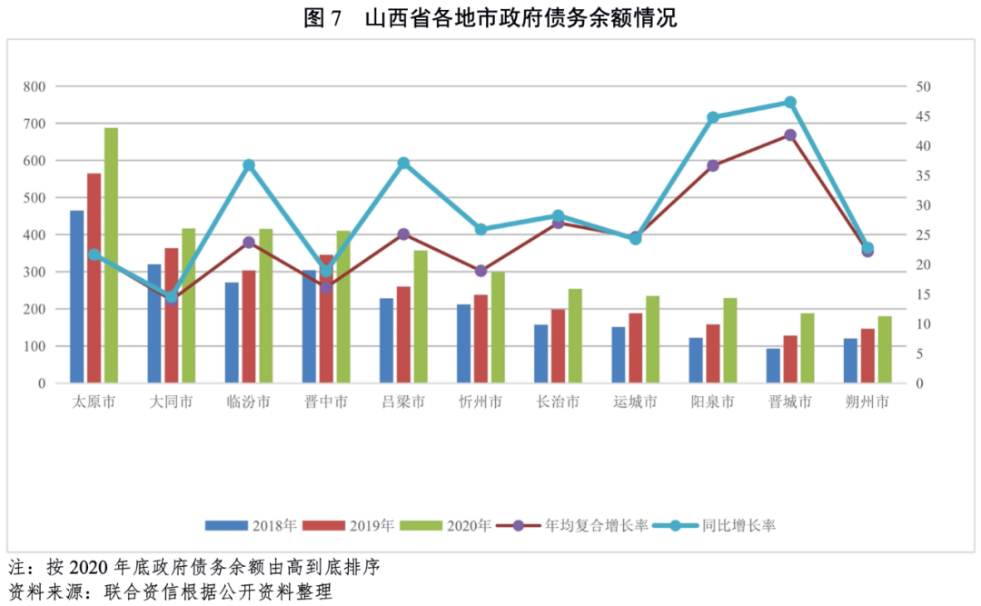 從地市層面看,山西省下轄各地市的經濟及財政實力差異較大。太原市的經濟發展水平和財政實力遠高于其他地市。山西省各地市政府債務余額均呈快速上升趨勢,晉城市增長最快。2020年,山西省各地市的負債率均較上年有所上升,但債務負擔仍處于較輕水平。陽泉市償債能力排名靠后,各地市整體償債壓力不大。