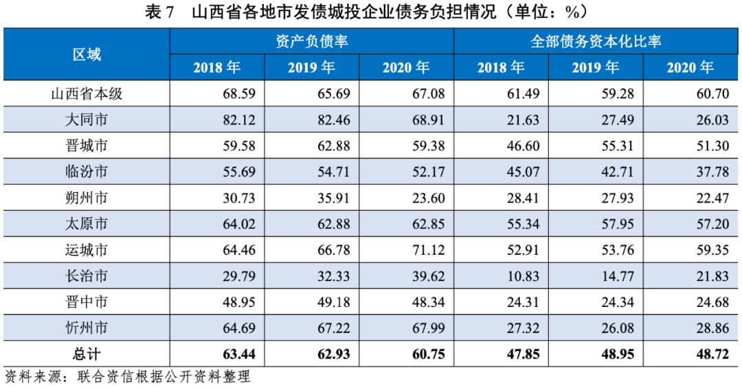 從債務負擔來看,2018-2020年,山西省城投企業資產負債率持續下降,全部債務資本化比率波動上升。2020年底,山西省本級、大同市、太原市、運城市和忻州市城投企業的資產負債率位居全省前列,均超過60%;山西省本級、晉城市、太原市和運城市城投企業全部債務資本化比率位居全省前四,均超過50%;其他地市全部債務資本化比率處于較低水平。