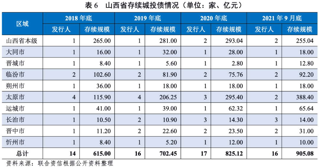 2018年至2021年9月底,山西省內存續城投債規模持續上升,有存續債券的城投企業數量變化不大。截至2021年9月底,山西省存續城投債余額共計905.08億元,與其他省/直轄市的城投債余額相比金額較小;山西省內有存續債券的城投企業共16家,以地級市城投企業為主,具體包括省本級企業2家,地級市企業11家、區縣級企業3家。其中,省本級和太原市存續的城投債余額相對較大,2021年9月底分別為255.04億元和388.40億元,合計占山西省存續城投債余額的71.09%;山西省下轄的陽泉市和呂梁市無存續城投債。