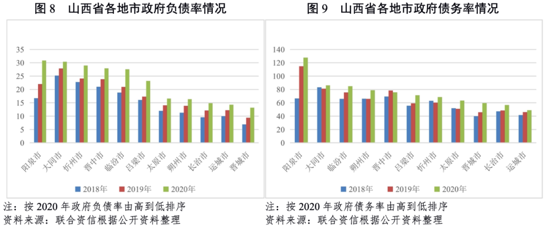 債務負擔方面,近年來山西省各地市負債率均持續上升。2020年,陽泉市、臨汾市和呂梁市政府負債率相對上升較快,分別較2019年上升8.82個百分點、6.62個百分點和5.93個百分點。總體看,山西省各地市債務負擔較輕。