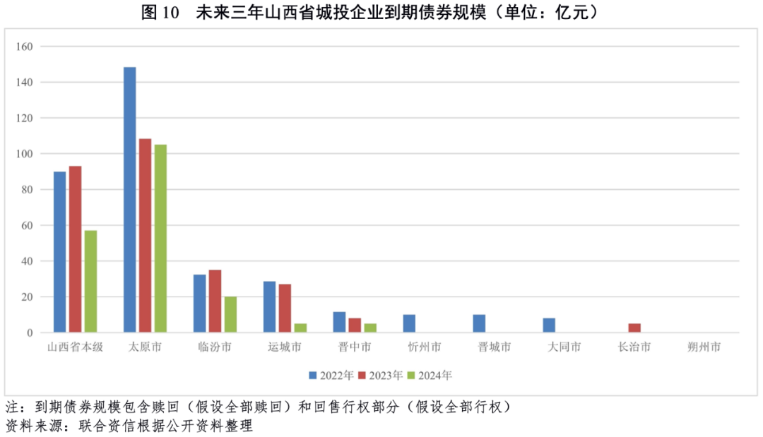 從山西省發債城投企業未來三年(2022-2024年)到期債券規模看,太原市和山西省本級城投企業排名前兩位,到期債券三年合計分別為361.70億元和240.04億元;臨汾市和運城市城投企業到期債券規模相對較大,合計均在50億元以上。2022年,山西省城投企業到期債券規模合計338.84億元,其中太原市和山西省本級城投企業到期債券規模較大,分別為148.40億元和89.94億元。