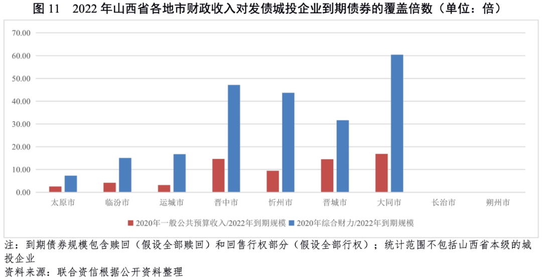 從地方一般公共預算收入對到期債券規模的覆蓋倍數來看,山西省各地市一般公共預算收入可以覆蓋當地城投企業2022年到期債券,太原市覆蓋倍數最低,為2.55倍,長治市和朔州市2022年無到期債券。考慮到各地市能夠獲得的政府性基金收入及上級補助收入,從綜合財力對到期債券的覆蓋倍數來看,各地市綜合財力對當地城投企業2022年到期債券的覆蓋倍數介于7.32倍至60.40倍之間。總體看,山西省各地市綜合財力對城投企業2022年到期債券的覆蓋能力較強,山西省各地市集中償付壓力較小。
